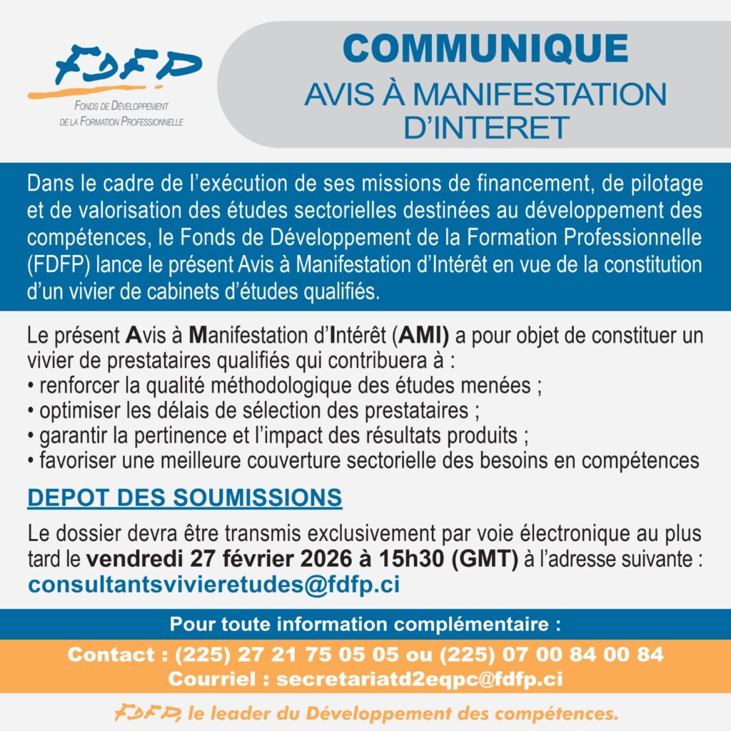 🚨Plus que quelques heures pour soumettre vos dossiers dans le cadre de l’Appel à Manifestation d’Intérêt en vue de la constitution d’un vivier de cabinets d’études qualifiés, lancé par le Fonds de Développement de la Formation Professionnelle (FDFP).